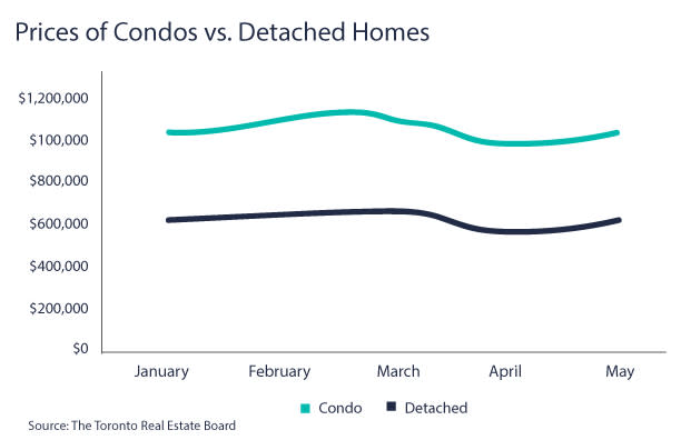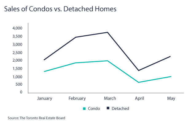 The sales volumes of condos and detached homes fell by a similar percentage as the pandemic hit. In May, we can see that the sale of detached homes are recovering slightly faster than condos.