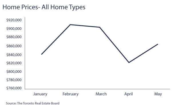 The average price of homes in Toronto fell by 9% to $820,272 from March to April as many buyers opted out of the real estate market. However, the sharp drop in prices in April were followed by a rise of 5% in May. The average home price in May increased to $863,599 but it still has a ways to recover compared to the peak of $910,290 in February.