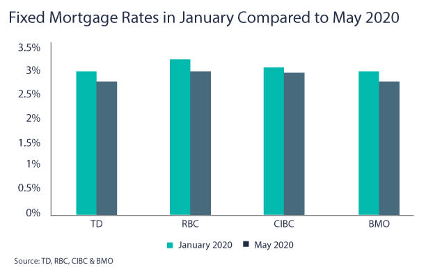 You may have seen that fixed mortgage rates have not changed by much even though the Bank of Canada’s target overnight rate went from 1.75% to 0.25% at the start of the COVID-19 pandemic. However, variable mortgages have dropped quickly given the Bank of Canada’s response. Actually, banks have entered a liquidity crisis since the start of COVID-19 because of an increase in the demand for loans. Given that this demand is expected to continue, the general expectation is that mortgage rates will not be lowered. Furthermore, banks are now dealing with a higher amount of mortgage deferrals and they need to ensure they can support themselves. A gradual decrease in fixed mortgage rates is expected as the risk of mortgage arrears and demand for loans lowers.