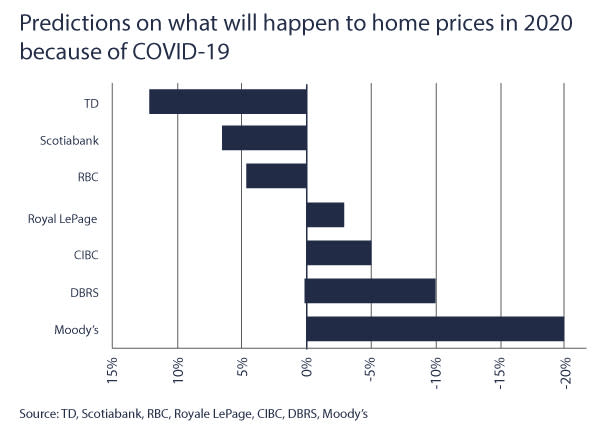 In late 2019, Royal LePage, RE/MAX and the Canadian Real Estate Association (CREA) had optimistic forecasts about Canadian real estate given the strong market activity. Home prices were expected to increase by 3.2% according to Royal LePage and as high as 6.7% according to CREA. Of course, no one could have predicted the impact of COVID-19 on the market. Newly revised forecasts show that Royal LePage predicts that home prices could rise by 1% if the economy recovers quickly from COVID-19 but prices could drop as much as 3%. Furthermore, RE/MAX is also predicting that home prices could drop by 2.9%. There has not been an update from CREA yet, but this is not surprising given the uncertainty of the economy, it is difficult to make a good prediction when things are changing quickly.