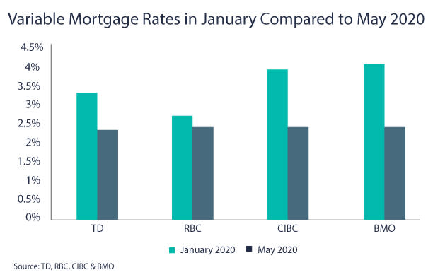 See in the graphs below how 5-year variable and fixed mortgage rates have changed at the largest Canadian banks from January to May 2020. You can see the minimal drop in fixed mortgage rates compared to variable rates. Fixed mortgage rates across TD, RBC, CIBC and BMO are relatively similar to each other but the variable rates have steep differences. Keep in mind that the rates that homeowners pay on their mortgages is usually different compared to the ones posted on banks’ websites.