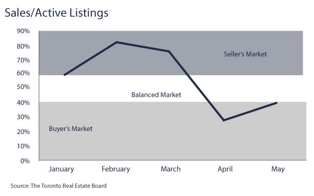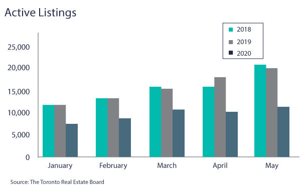 Before COVID-19, the number of listings in January to March were already fewer than the same period in 2018 and 2019. The shortage of listings drove a hot market in Toronto given the low supply and large pool of buyers. In April and May, there were relatively the same number of listings than there were in March though the pandemic has kept many sellers from putting their homes on the market.