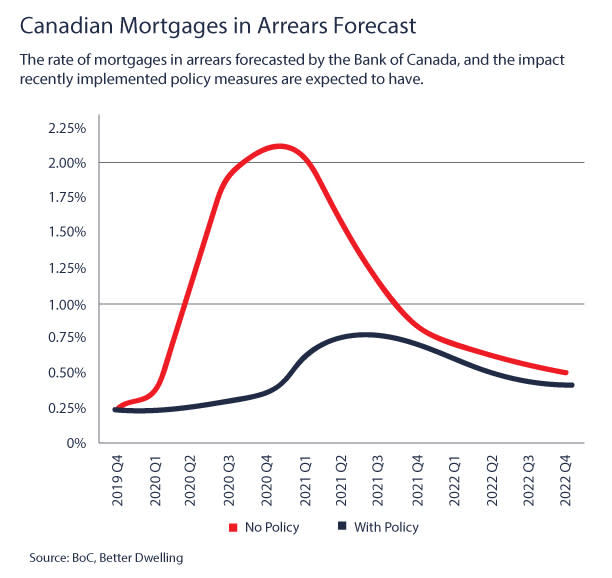 The Bank of Canada expected mortgage arrears to be nearly 3 times as worse if no policy was implemented. They expected mortgages arrears to increase by 48% in Q1 compared to Q4 2019 which means that even without COVID-19, there was concern of debt levels rising too much.